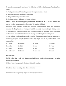 cashiers (3) they are ready to purchase items. They might also (4) any cashier duties when understaffed. 1. A. needs B. demands C. offers D. actions 2. A. when B. which C. who D. where 3. A. who B. where C. who D. when 4. A. take after B. take out C. take over D. take in III. WRITING