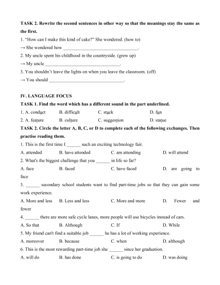 TASK 1. Find the word which has a different sound in the part underlined. 1. A. conduct B. difficult C. stuck D. fun 2. A. feature B. culture C. suggestion D. statue