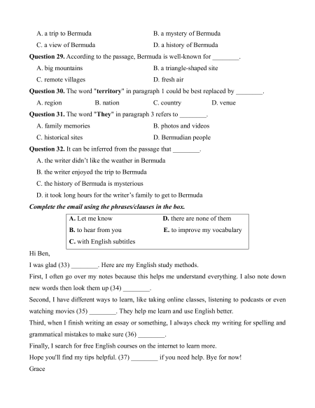 Question 29. According to the passage, Bermuda is well-known for ________. A. big mountains B. a triangle-shaped site C. remote villages D. fresh air