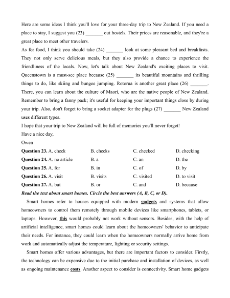I hope that your trip to New Zealand will be full of memories you'll never forget! Have a nice day, Owen Question 23. A. check B. checks C. checked D. checking