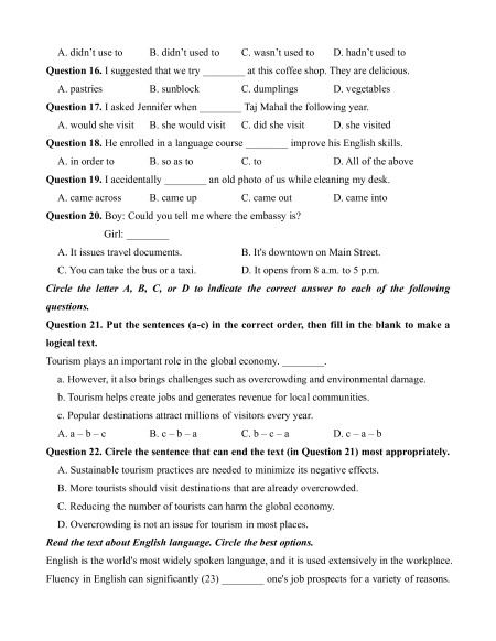 Question 18. He enrolled in a language course ________ improve his English skills. A. in order to B. so as to C. to D. All of the above