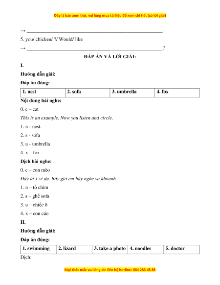 ĐÁP ÁN VÀ LỜI GIẢI: I. Hướng dẫn giải: Đáp án đúng: 1. nest 2. sofa 3. umbrella 4. fox Nội dung bài nghe: 0. c – cat