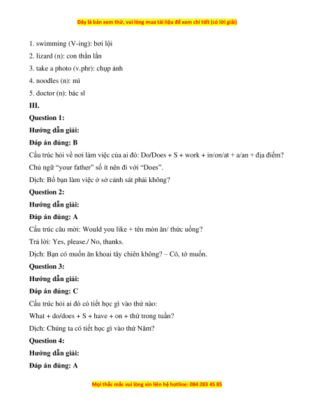 Đây là 1 ví dụ. Bây giờ em hãy nghe và khoanh. 1. n – tổ chim 2. s – ghế sofa 3. u – chiếc ô 4. x – con cáo II. Hướng dẫn giải: Đáp án đúng: 1. swimming 2. lizard
