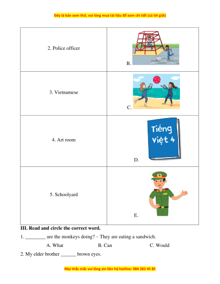 2. Police officer B. 3. Vietnamese C. 4. Art room D. 5. Schoolyard E.
