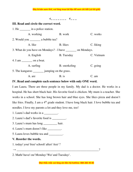 Đề thi cuối kì 1 Family & Friends 4 Đề 5