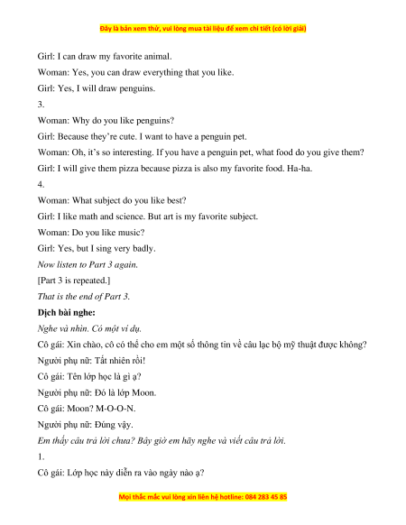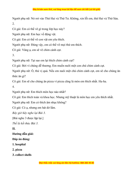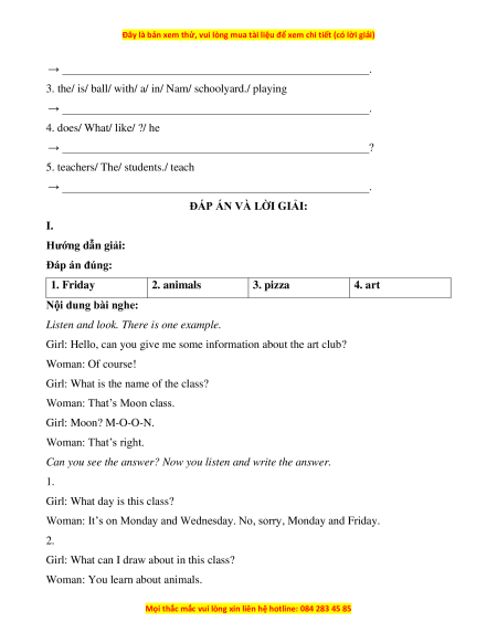 ĐÁP ÁN VÀ LỜI GIẢI: I. Hướng dẫn giải: Đáp án đúng: 1. Friday 2. animals 3. pizza 4. art Nội dung bài nghe: