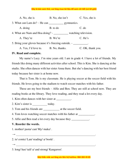 5. Bring your gloves because it’s freezing outside. - __________. A. Yes, I’d love to. B. No, thanks. C. OK, thank you. IV. Read and complete.