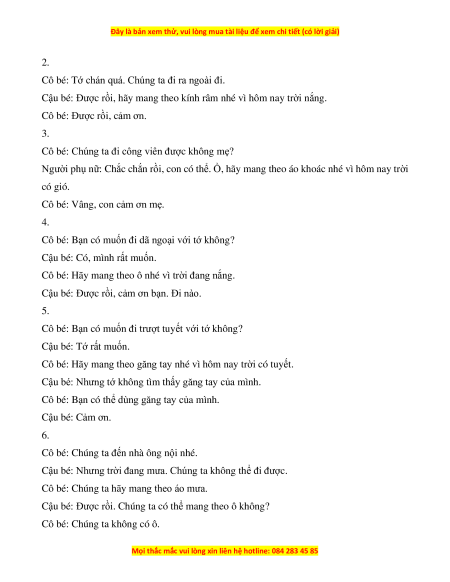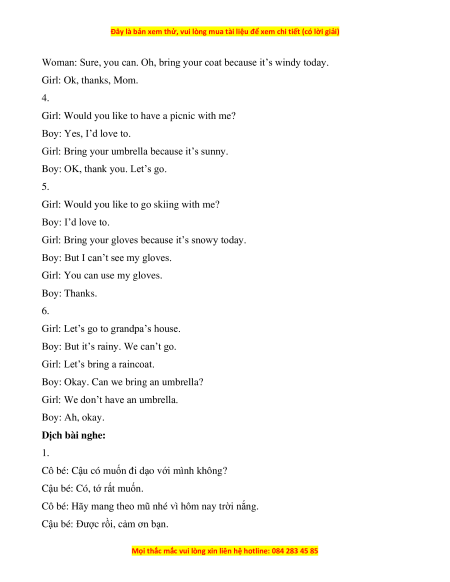Girl: We don’t have an umbrella. Boy: Ah, okay. Dịch bài nghe: 1.