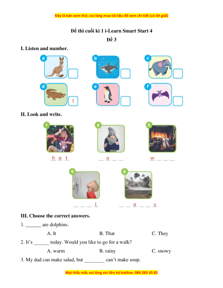 Đề thi cuối kì 1 i-Learn Smart Start 4 Đề 3 I. Listen and number. II. Look and write.