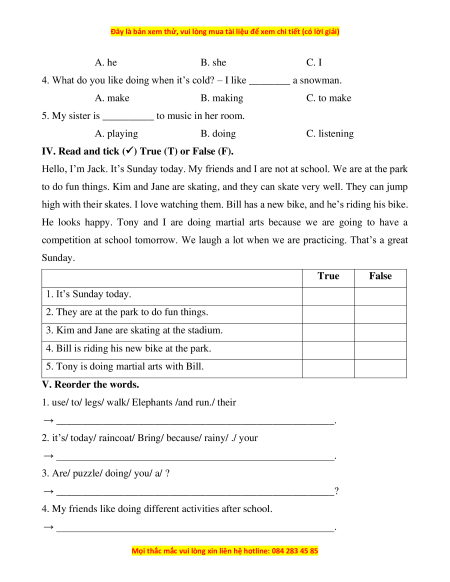 4. What do you like doing when it’s cold? – I like ________ a snowman. A. make B. making C. to make