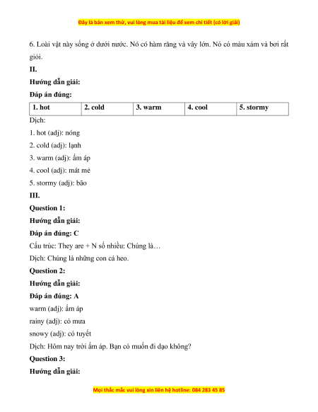 6. Loài vật này sống ở dưới nước. Nó có hàm răng và vây lớn. Nó có màu xám và bơi rất giỏi. II. Hướng dẫn giải: Đáp án đúng: 1. hot 2. cold 3. warm 4. cool 5. stormy Dịch: 1. hot (adj): nóng 2. cold (adj): lạnh 3. warm (adj): ấm áp 4. cool (adj): mát mẻ 5. stormy (adj): bão III. Question 1: Hướng dẫn giải: Đáp án đúng: C