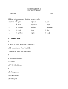 c. Annie is my sister. She likes dolphins. 2. a. There are 20 dolphins. b. Yes, I do. c. It’s 99 Oxford Street. 3. a. He’s Janpanese. b. He likes orange. c. He’s helpful. 4. a. She likes going for a walk. b. She is watching a cartoon. c. She has a lot of friends. 5.
