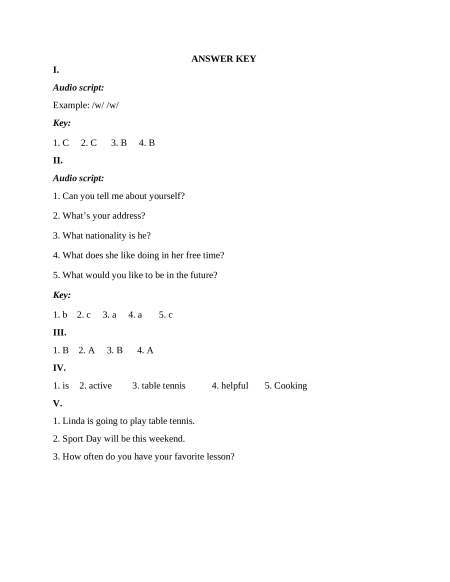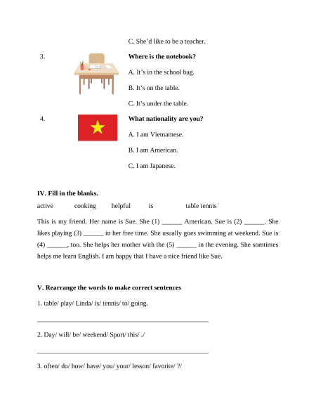 What nationality are you? A. I am Vietnamese. B. I am American. C. I am Japanese. IV. Fill in the blanks. active cooking helpful is table tennis