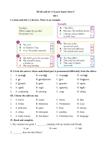 II. Circle the answer whose underlined part is pronounced differently from the others. 1. A. painted B. watched C. wrapped D. washed 2. A. go B. grandparents C. give D. Singapore 3. A. Canada B. cake C. cupcake D. ocean 4. A. candy B. scary C. camping D. badly 5. A. computers B. pictures C. vans D. ethics