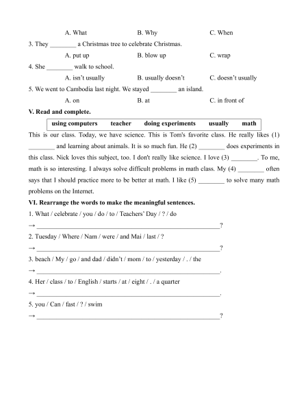 5. We went to Cambodia last night. We stayed ________ an island. A. on B. at C. in front of V. Read and complete. using computers teacher doing experiments usually math