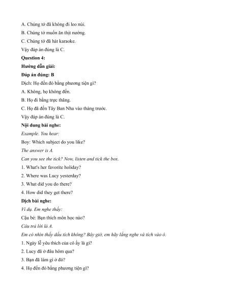 1. What's her favorite holiday? 2. Where was Lucy yesterday? 3. What did you do there? 4. How did they get there? Dịch bài nghe: