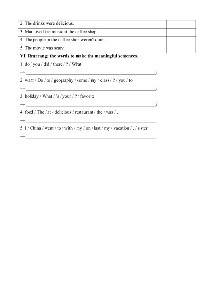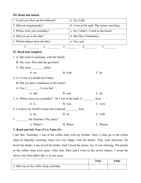 c. No, I didn’t. I went to the beach. 4. Did you go to the lake? d. She likes Vietnamese.