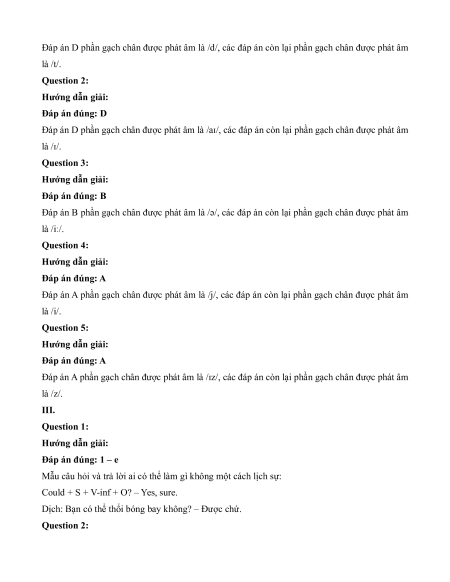 6. Cậu bé: Jane đã trồng một ít hoa vào hôm qua. II. Question 1: Hướng dẫn giải: Đáp án đúng: D