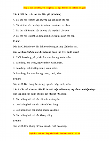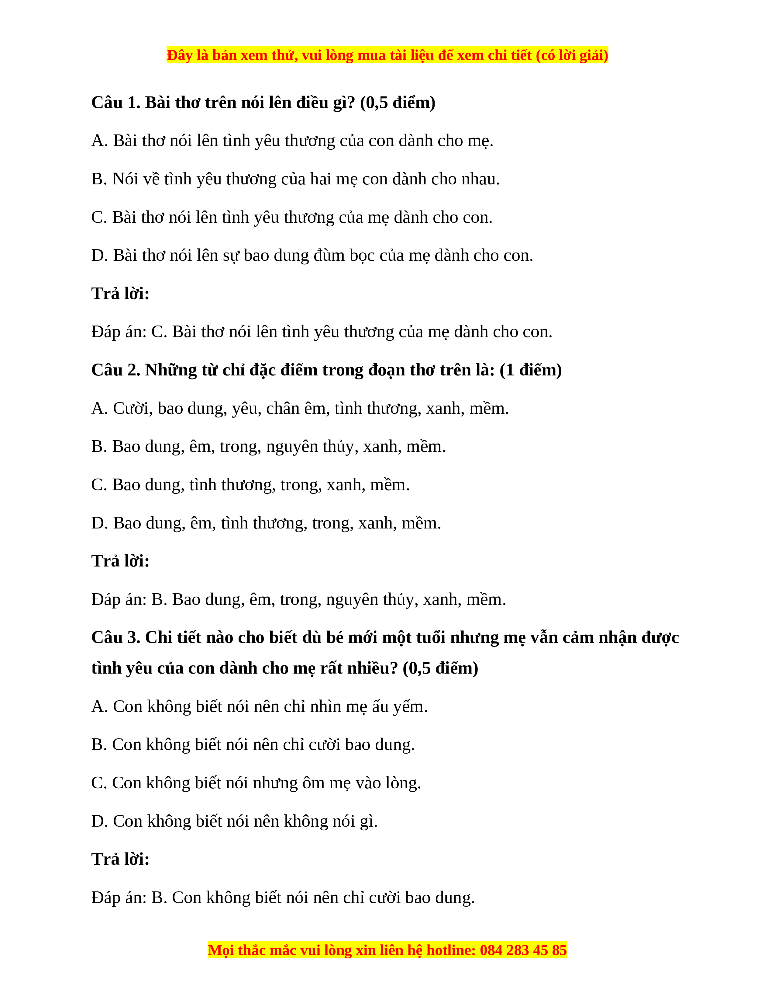 D. Bài thơ nói lên sự bao dung đùm bọc của mẹ dành cho con. Trả lời: