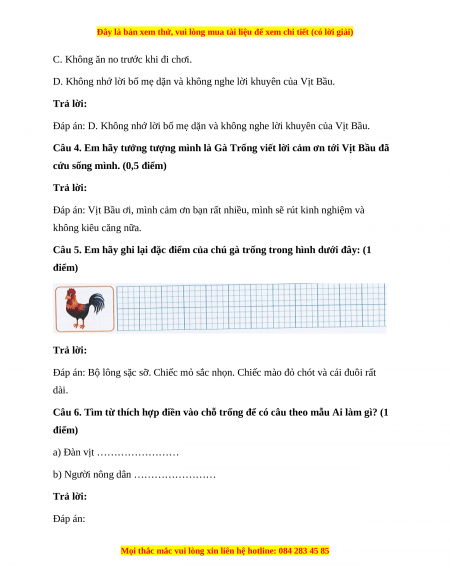 Câu 5. Em hãy ghi lại đặc điểm của chú gà trống trong hình dưới đây: (1 điểm) Trả lời: