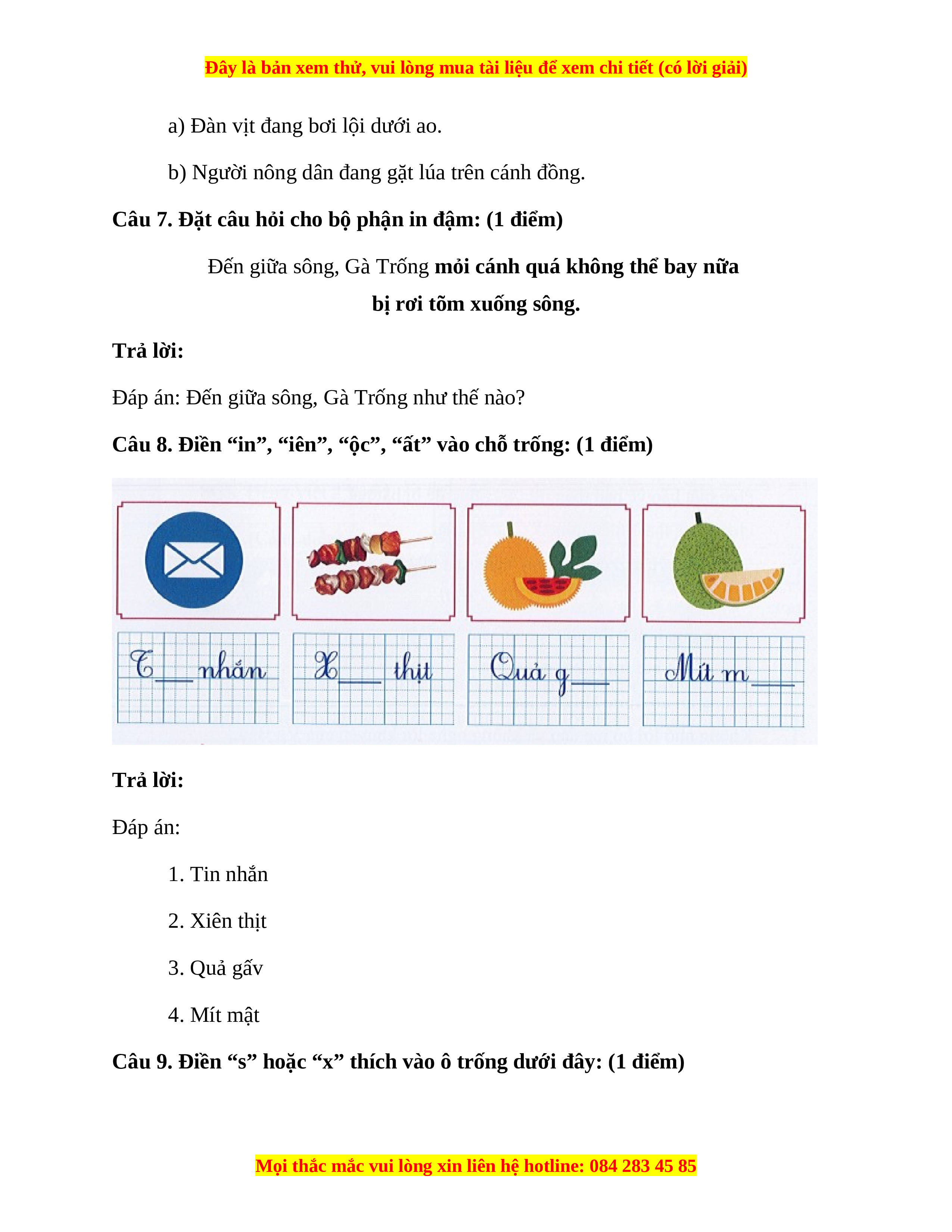 Câu 8. Điền “in”, “iên”, “ộc”, “ất” vào chỗ trống: (1 điểm) Trả lời: Đáp án: 1. Tin nhắn 2. Xiên thịt 3. Quả gấv 4. Mít mật