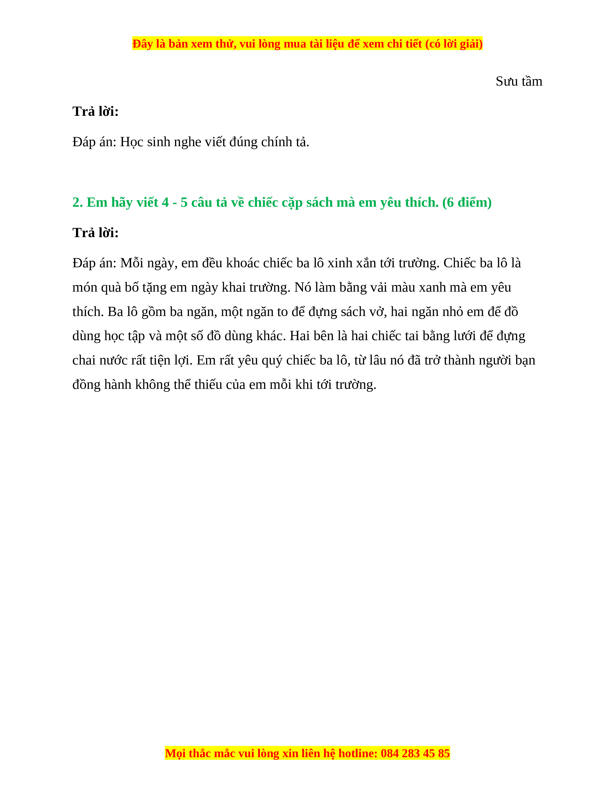 2. Em hãy viết 4 - 5 câu tả về chiếc cặp sách mà em yêu thích. (6 điểm)