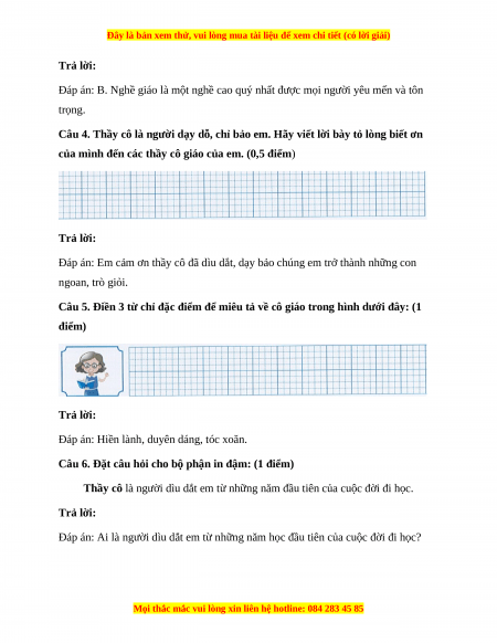 Câu 5. Điền 3 từ chỉ đặc điểm để miêu tả về cô giáo trong hình dưới đây: (1 điểm) Trả lời: