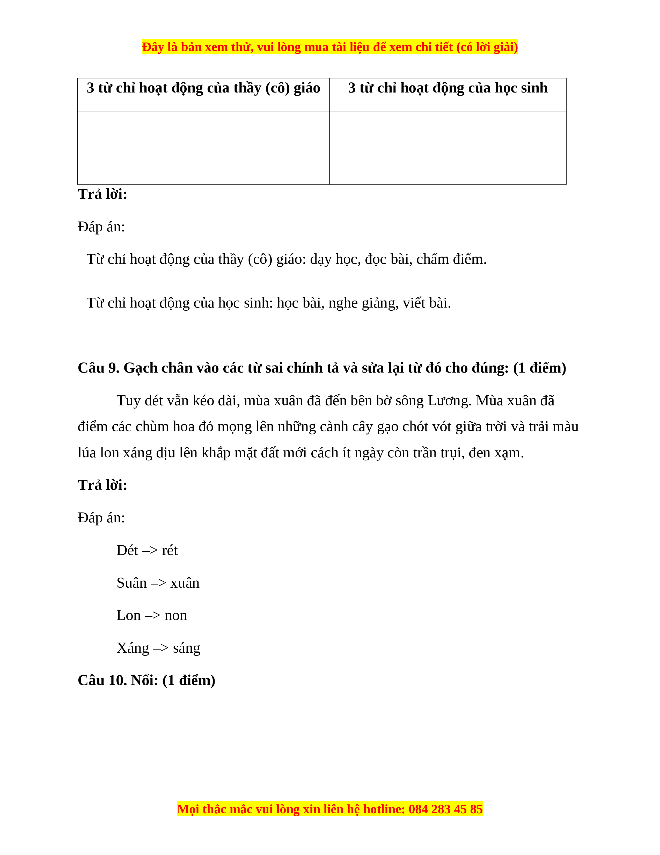 Câu 9. Gạch chân vào các từ sai chính tả và sửa lại từ đó cho đúng: (1 điểm)