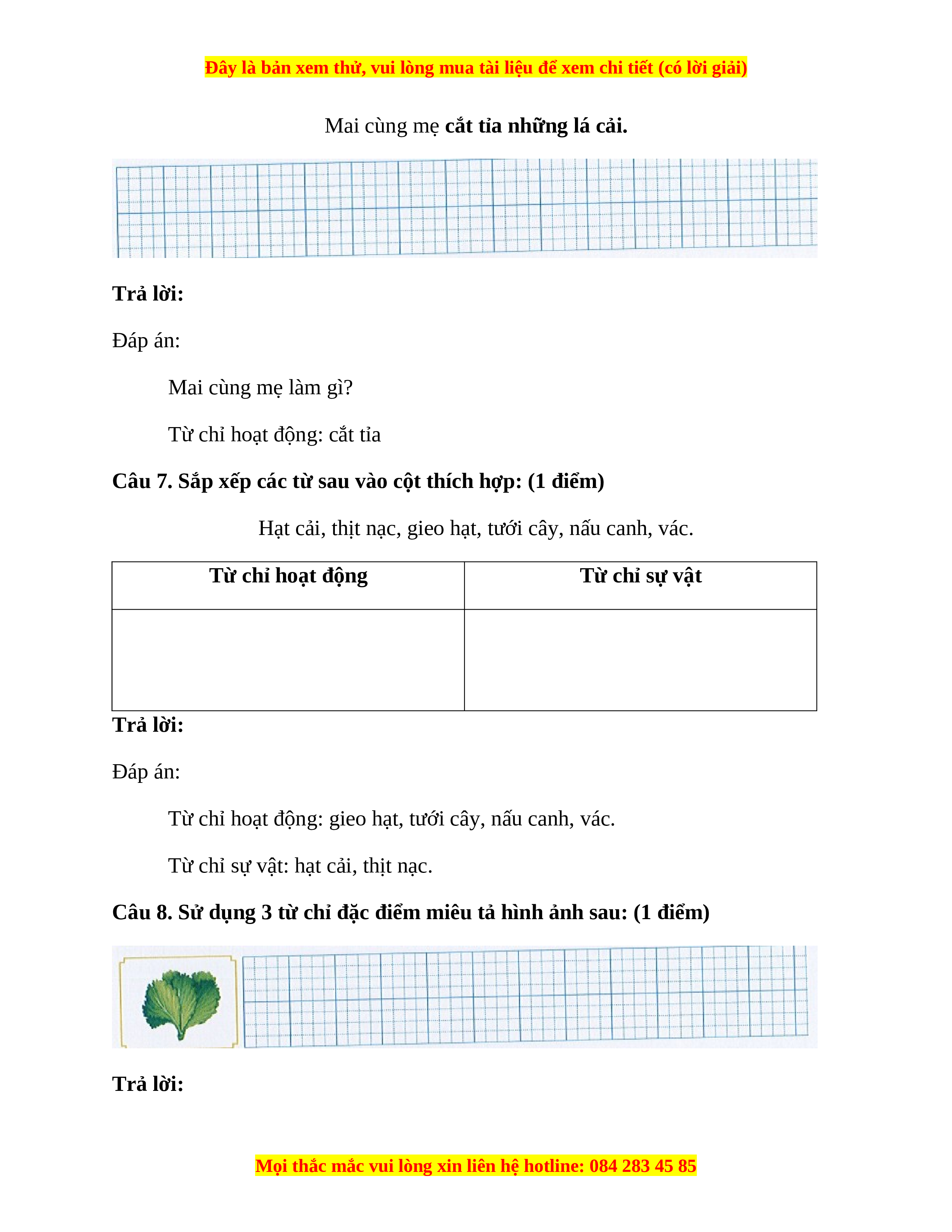Mai cùng mẹ cắt tỉa những lá cải. Trả lời: Đáp án: Mai cùng mẹ làm gì?