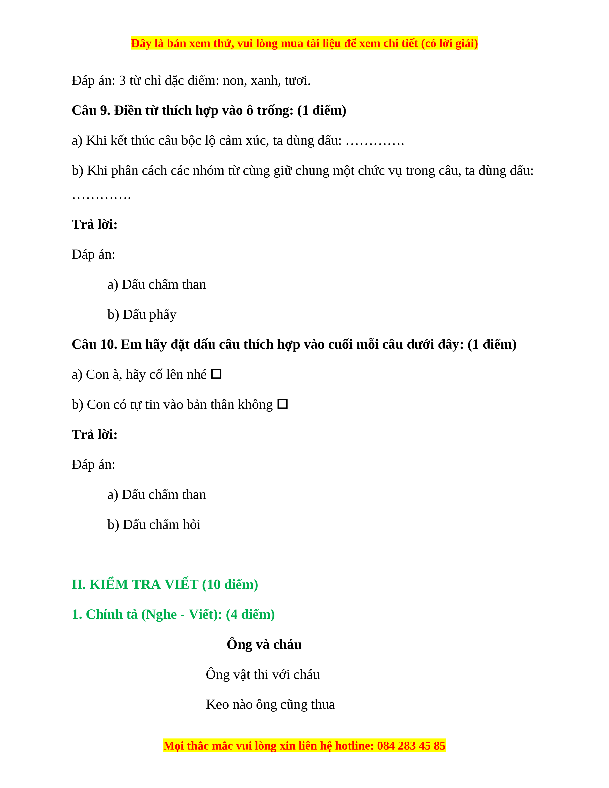 Câu 10. Em hãy đặt dấu câu thích hợp vào cuối mỗi câu dưới đây: (1 điểm)