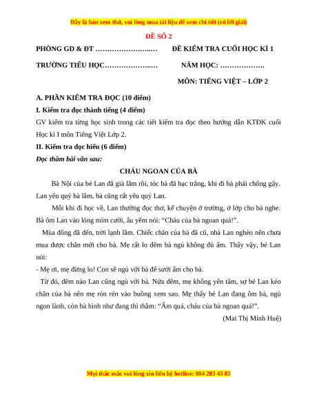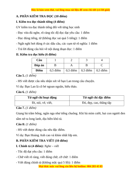 A. PHẦN KIỂM TRA ĐỌC (10 điểm)