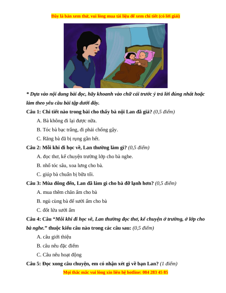 Câu 1: Chi tiết nào trong bài cho thấy bà nội Lan đã già? (0,5 điểm)