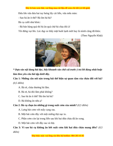 Câu 3: Vì sao bà cụ không ăn hết suất cơm khi hai đứa cháu mang đến? (0,5 điểm)