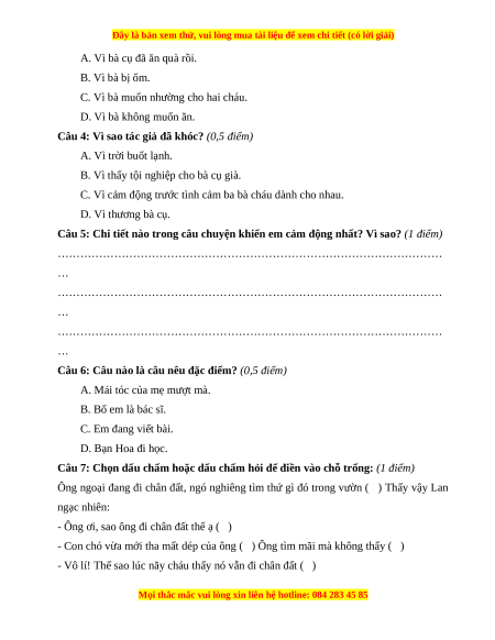 Câu 4: Vì sao tác giả đã khóc? (0,5 điểm) A. Vì trời buốt lạnh.
