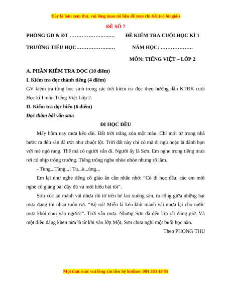 A. PHẦN KIỂM TRA ĐỌC (10 điểm)