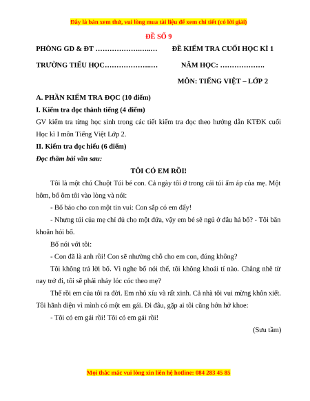 A. PHẦN KIỂM TRA ĐỌC (10 điểm)