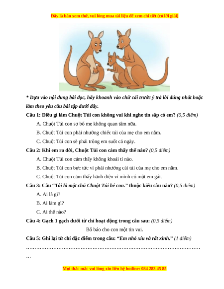 Câu 1: Điều gì làm Chuột Túi con không vui khi nghe tin sắp có em? (0,5 điểm)