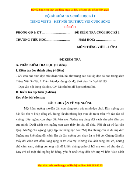 TIẾNG VIỆT 3 – KẾT NỐI TRI THỨC VỚI CUỘC SỐNG ĐỀ SỐ 1
