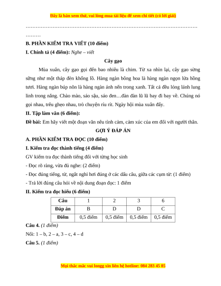 I. Chính tả (4 điểm): Nghe – viết Cây gạo
