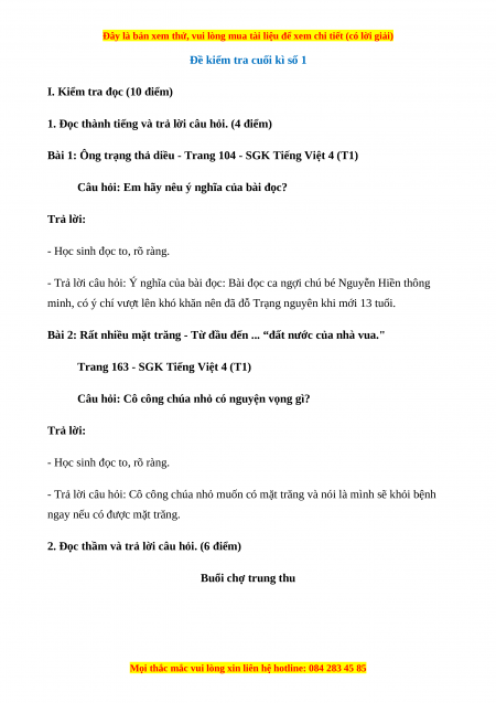 1. Đọc thành tiếng và trả lời câu hỏi. (4 điểm)