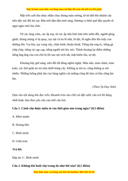 Câu 1. Cảnh chợ được miêu tả vào thời gian nào trong ngày? (0,5 điểm) A. Đêm muộn B. Hoàng hôn C. Bình minh D. Giữa trưa Trả lời: Đáp án: C. Bình minh