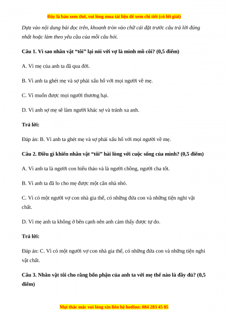 Câu 3. Nhân vật tôi cho rằng bổn phận của anh ta với mẹ thế nào là đầy đủ? (0,5 điểm)