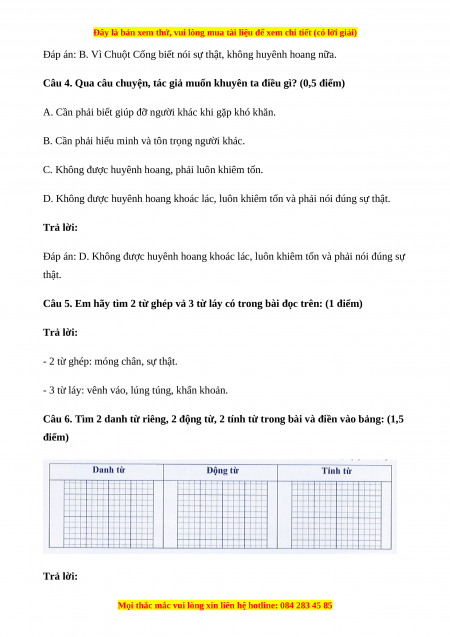 Câu 6. Tìm 2 danh từ riêng, 2 động từ, 2 tính từ trong bài và điền vào bảng: (1,5 điểm) Trả lời:
