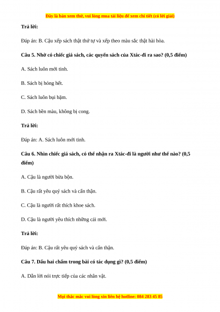 Câu 5. Nhờ có chiếc giá sách, các quyển sách của Xtác-đi ra sao? (0,5 điểm) A. Sách luôn mới tinh. B. Sách bị hỏng hết. C. Sách luôn bụi bặm.