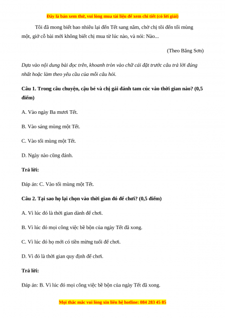 Câu 1. Trong câu chuyện, cậu bé và chị gái đánh tam cúc vào thời gian nào? (0,5 điểm) A. Vào ngày Ba mươi Tết.
