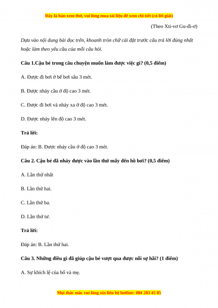 Câu 2. Cậu bé đã nhảy được vào lần thứ mấy đến hồ bơi? (0,5 điểm) A. Lần thứ nhất B. Lần thứ hai. C. Lần thứ ba. D. Lần thứ tư. Trả lời: