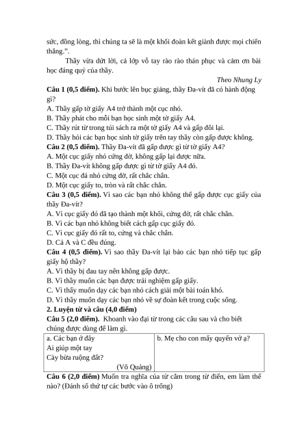 Câu 4 (0,5 điểm). Vì sao thầy Đa-vít lại bảo các bạn nhỏ tiếp tục gấp giấy hộ thầy?