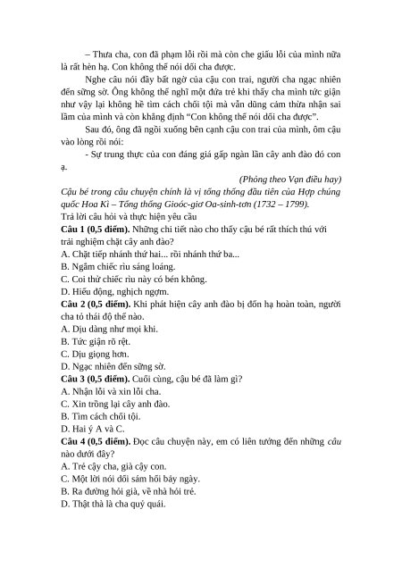 Câu 2 (0,5 điểm). Khi phát hiện cây anh đào bị đốn hạ hoàn toàn, người