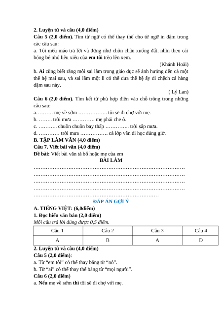 2. Luyện từ và câu (4,0 điểm) Câu 5 (2,0 điểm):