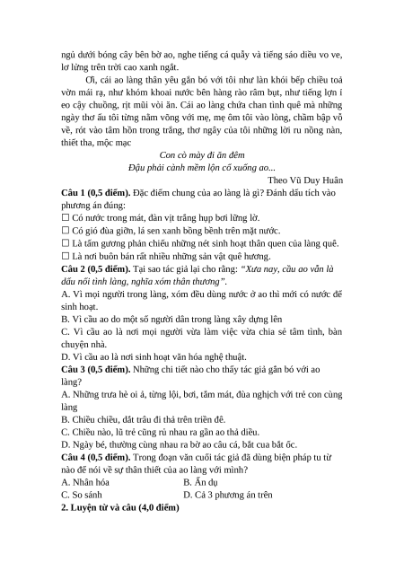 Đọc đoạn văn sau và trả lời câu hỏi: AO LÀNG